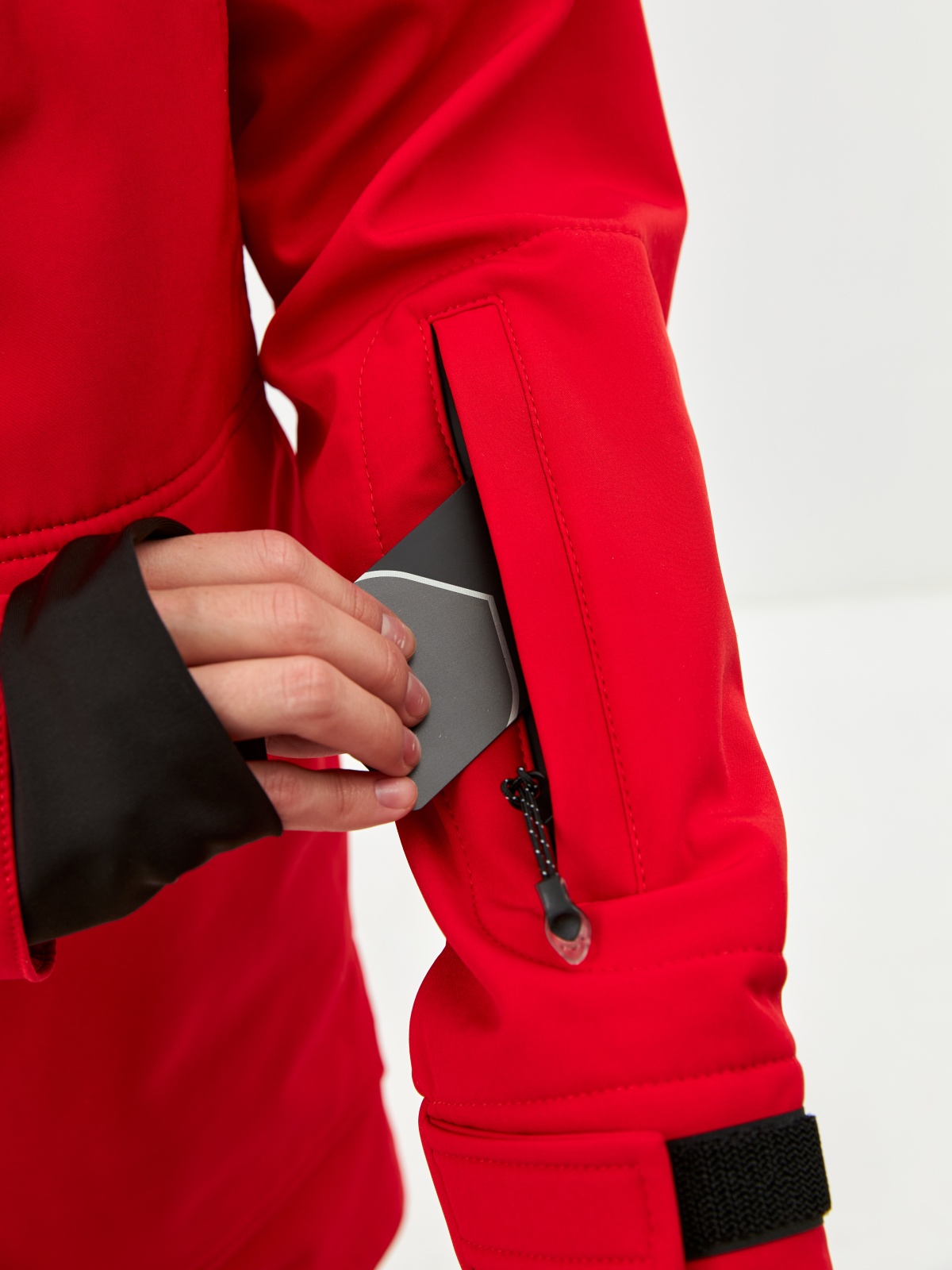 • Карман для ski-pass на рукаве, нагрудный карман и большой карман-кенгуру — всё на влагостойких молниях.
