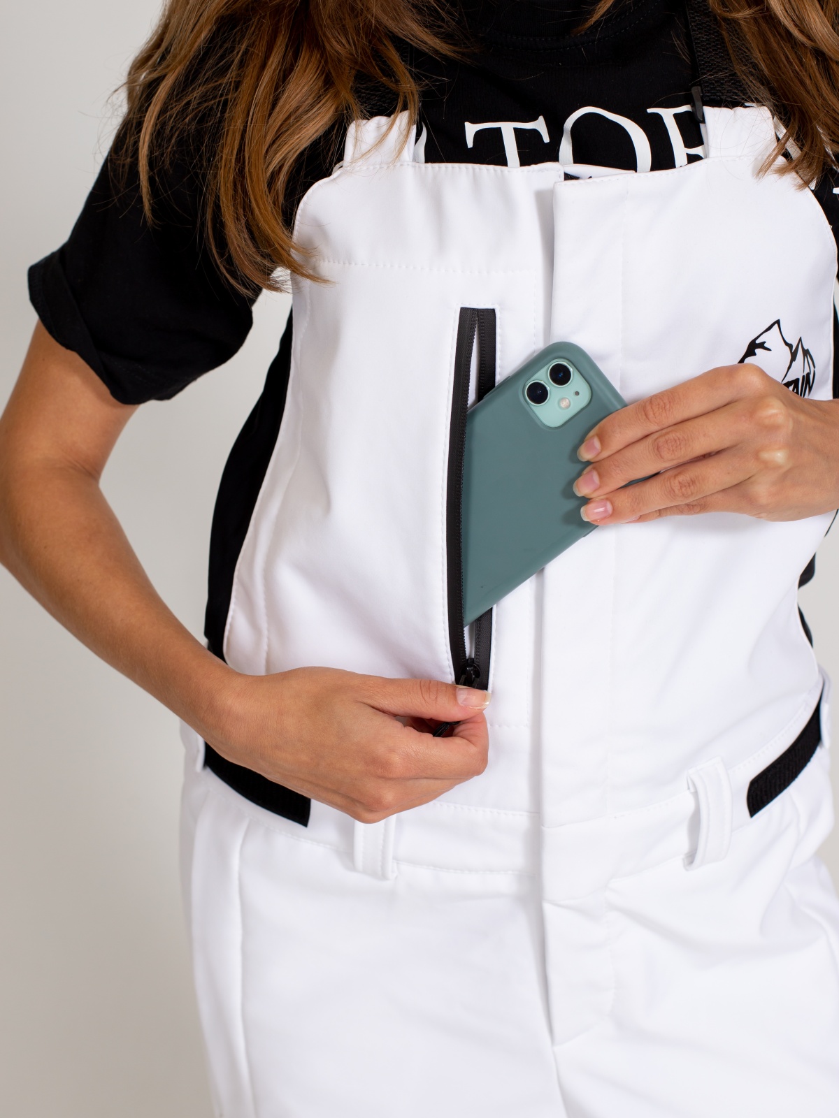• Нагрудный и набедренный карманы на влагозащитной молнии — удобно хранить ски-пасс, телефон или мелочи.